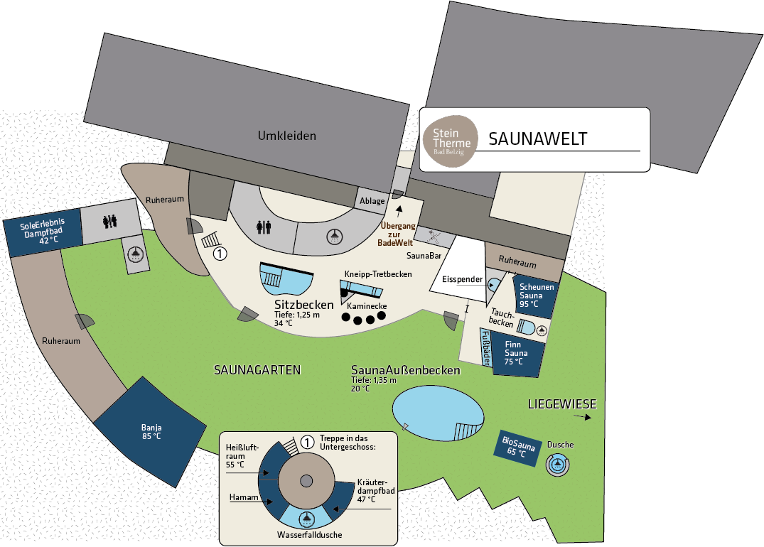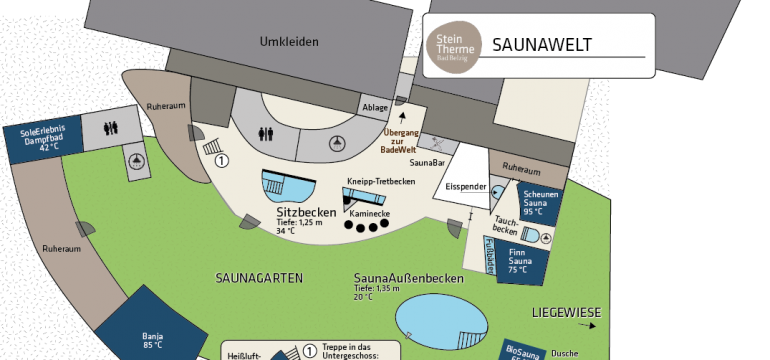 Einen detaillierten Überblick über die SaunaWelt, mit den verschiedenen Saunen und Becken erhalten Sie auf dem Lageplan der SaunaWelt.